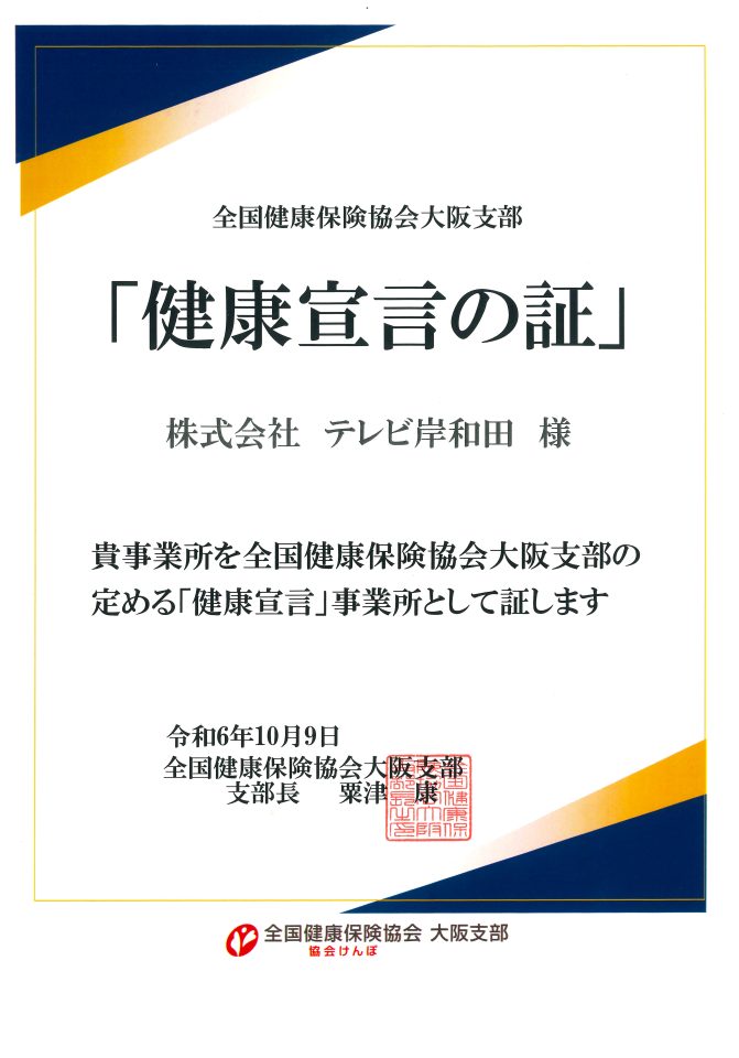 当社では社員の健康管理の重要性を認識し、これまで以上に健康増進活動を推進していくため、2024年10月に全国健康保険協会大阪支部に「健康宣言」を行い、「健康宣言の証」を受領しました。