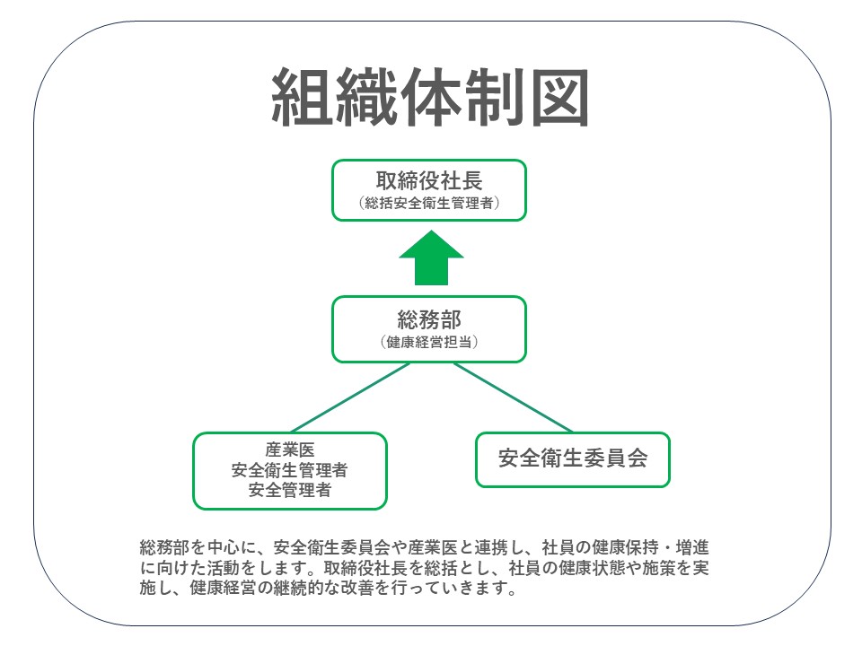 代表取締役社長を中心とした体制のもと、総務部が健康経営の推進を担当し、産業医および安全衛生委員会と連携しながら社員の健康保持・増進に取り組んでいます。